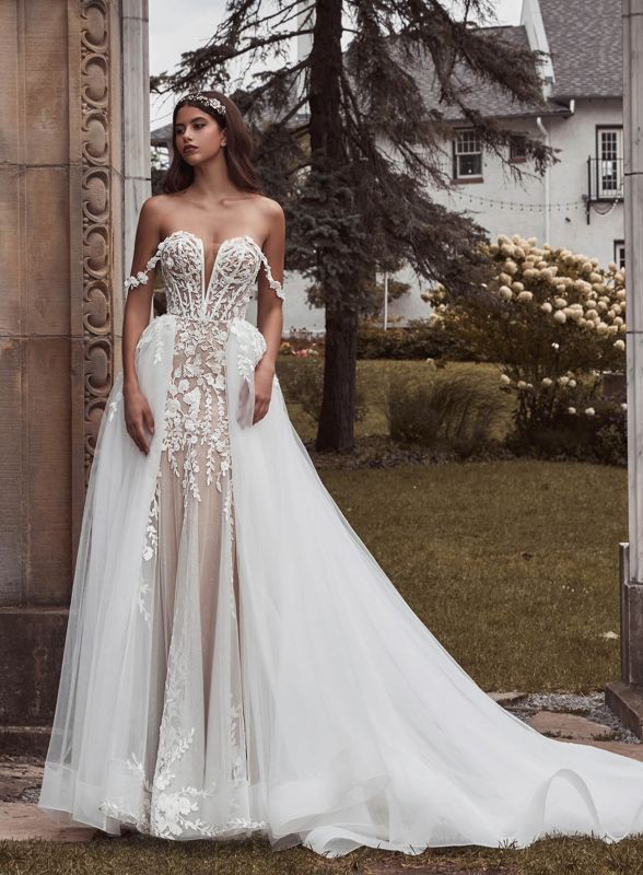 Visions of vintage lace are realized in this glamorous wedding gown. This dress features the ever-so-sexy mermaid silhouette and a romantic sweetheart neckline. Romantic floral off- the shoulder straps, a luxurious tulle overskirt, and a matching veil complete this divine bridal look.
