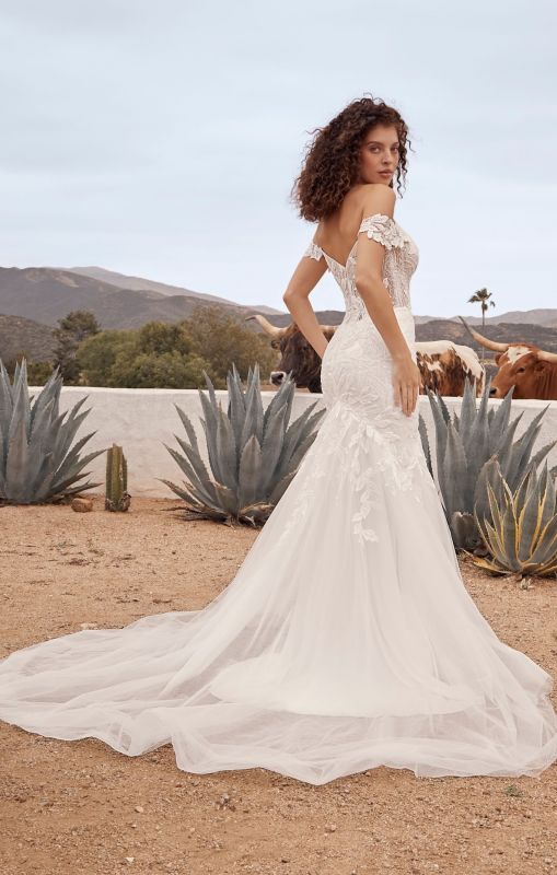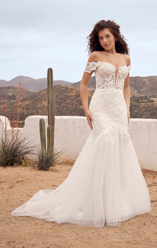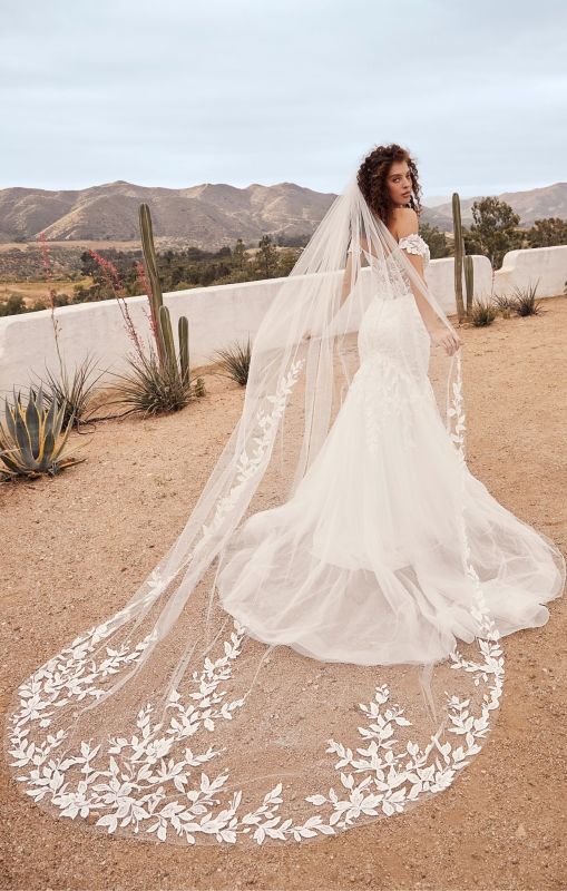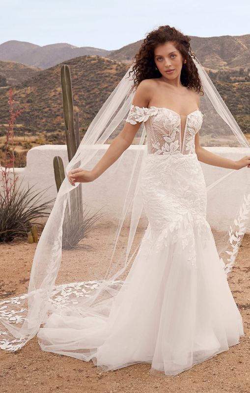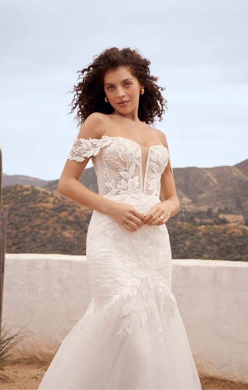 Elegant, captivating and elevated. Style BL443 Hunter is made for the modern bride seeking sophistication and effortless allure. Hunter is the gown that offers a new detail at every glance. Drawing your eye into the sequined underlayer, Hunter’s romantic beaded floral lace adds a pop of sophistication that adorns her illusion bodice and upper skirt. Her neckline falls into a deep V plunge with delicate off the detachable shoulder sleeves, mirrored on the back in a deep V cut-out. Hunter is formed in a feminine fit and flare silhouette, with layers of cascading tulle to create a full skirt and 76? train. Her plunge illusion bodice is constructed of 14-piece signature boning and cups for a supportive and comfortable fit to ensure you feel confident on your wedding day. Hunter flatters all body shapes especially our gorgeous curve brides and can be paired with her matching cathedral veil (sold separately).