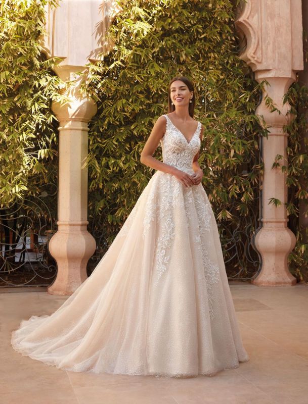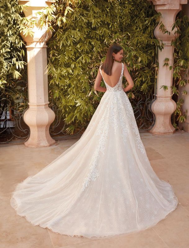 Glimmering beaded Tulle and ornate lace create this dreamy Princess cut design featuring an alluring deep V-neckline, plunging back and luxurious Chapel train