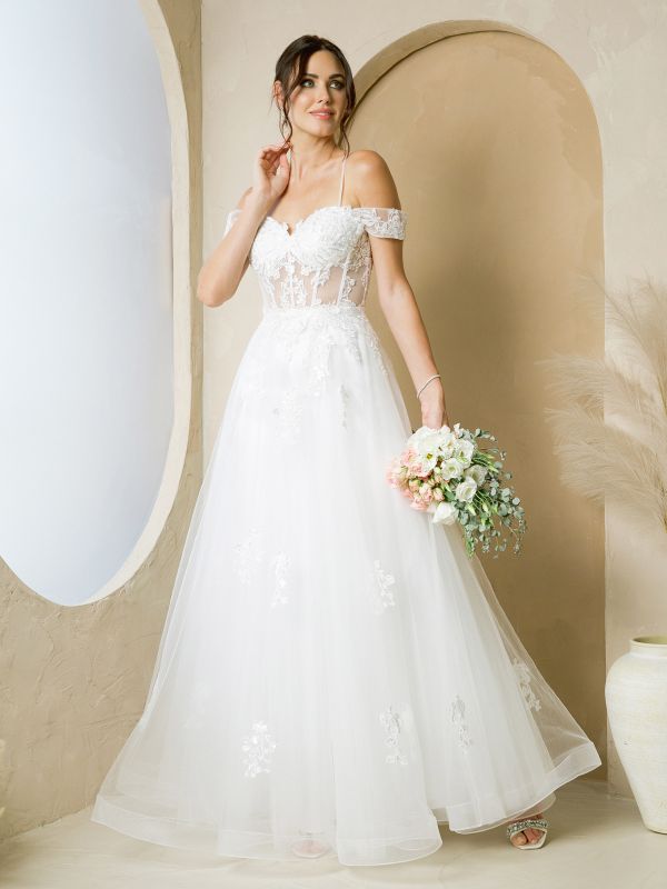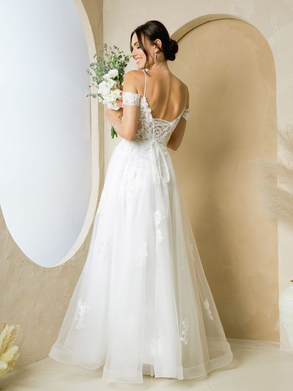 TULLE A-LINE GOWN WITH LACE APPLIQUES AND REMOVABLE SHOULDER SLEEVES