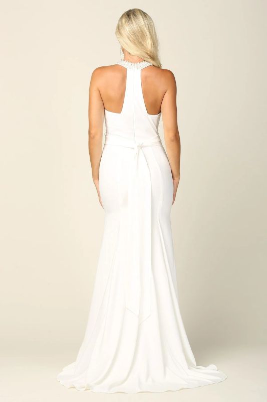 Elegant sheath style halter bridal gown with beaded neckline and removable thick band belt. T-back detail. Fully lined with bra cups, and back zip. Sweep train.