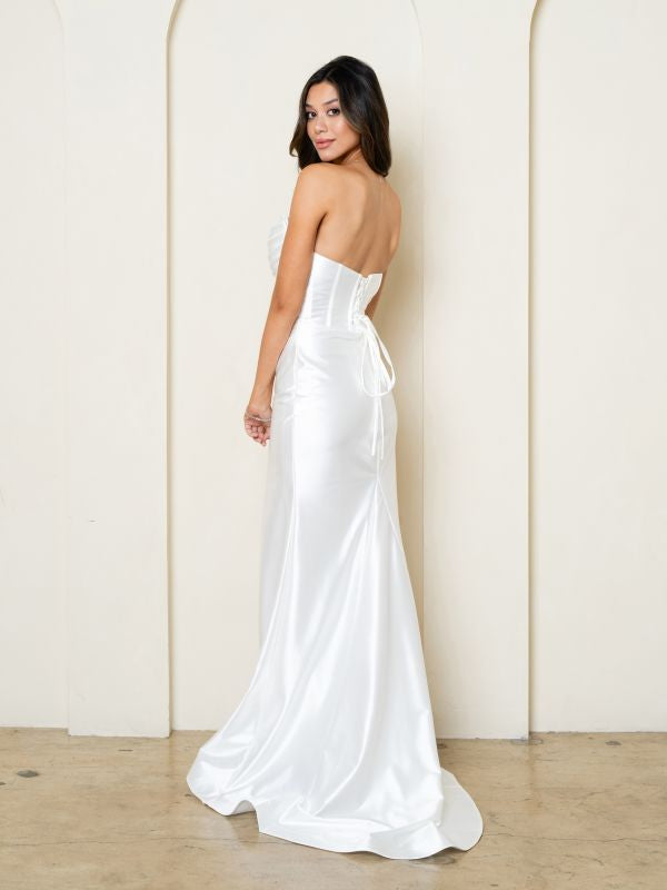 Strapless stretch satin fit and flare wedding gown with sweetheart bustline and faux cowl drape. Also has cover boning detail on bodice. Fully lined with built in bra cups and corset back with zipper for easy wear. Has 2" hard net at hem for added volume,