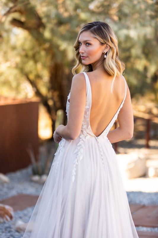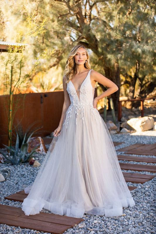 tank style deep v neck with illusion, delicately beaded bodice of leafy vines cascading down onto a full a line skirt with horsehair hem, semi cathedral train