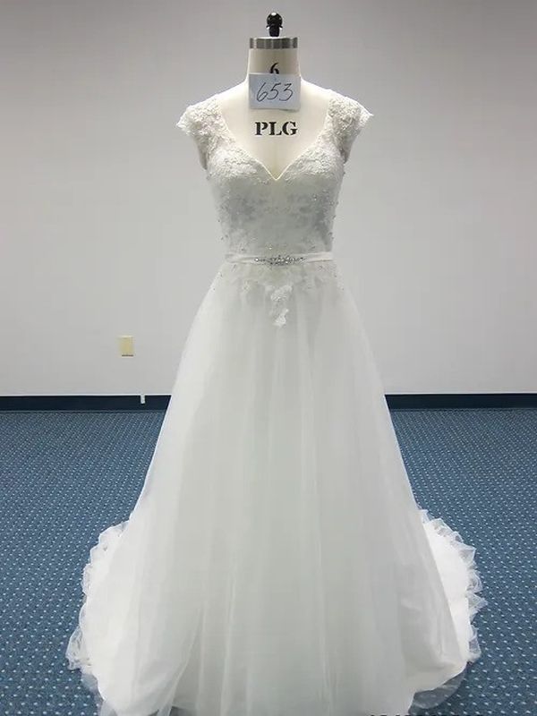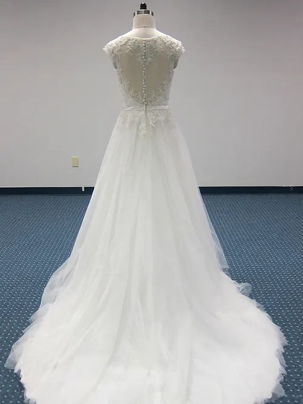lace cap sleeve v-neckline with satin belted waist full illusion back button and loop closure a-line tulle skirt and semi-cathedral train