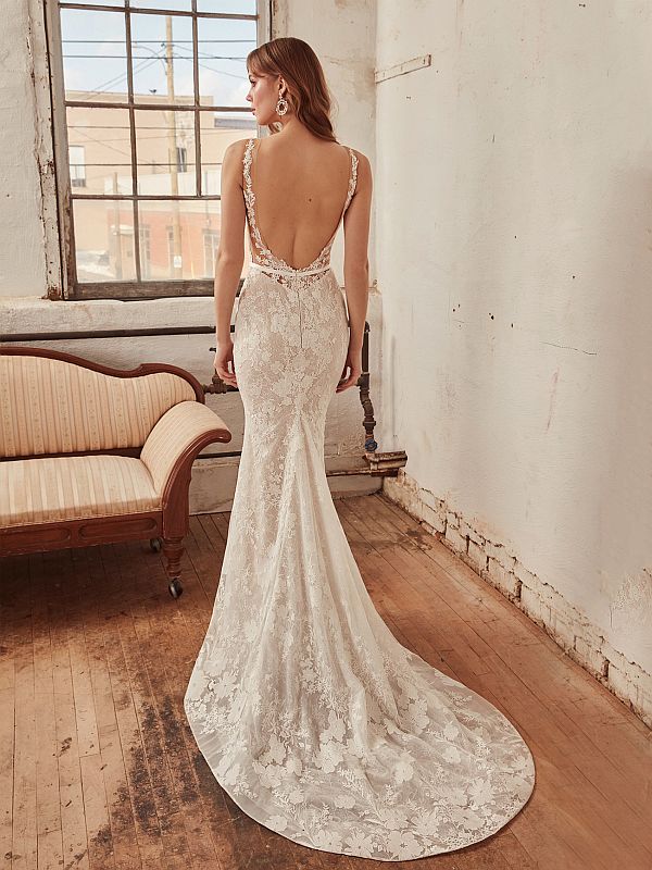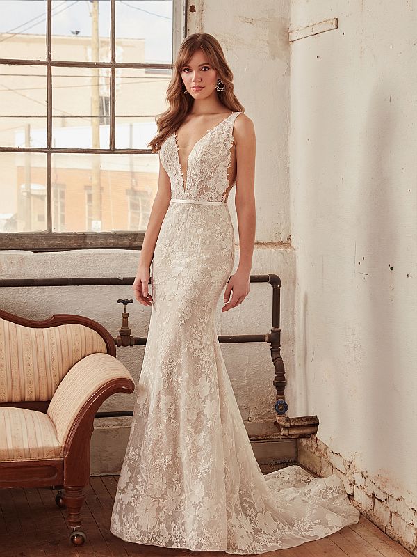 Plunging v neck front a back, tank style all over floral cotton lace throughout, chapel length train