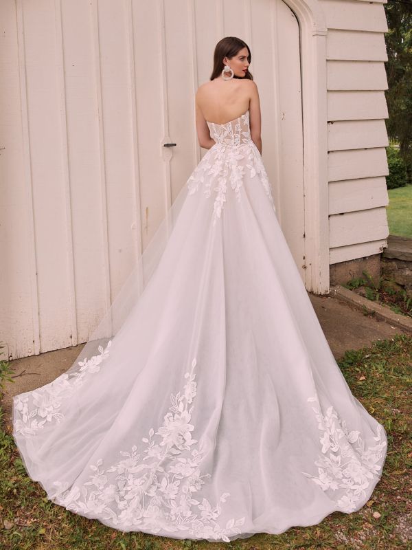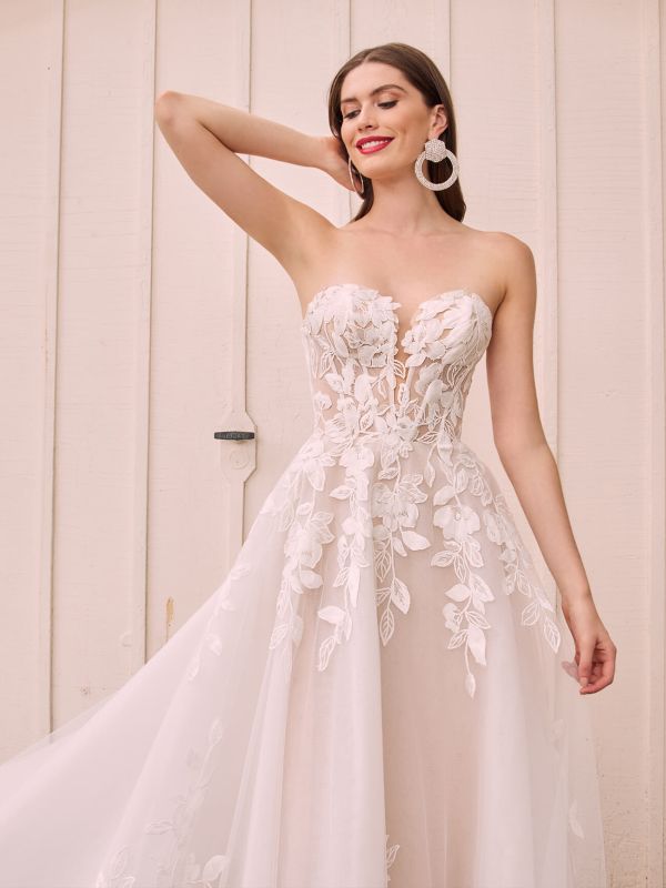 You were born to wear this delicate, strapless A line wedding dress while you commit to spending the rest of your life with your best friend. No matter what type of dress you think you want, we implore you to try her on because we’re sure you’ll fall in love with her charming floral lace and sweetheart neckline. Not to mention her detachable off the shoulder tulle sleeves and matching veil, sold separately, will give you the bridal moment you’ve been waiting for!