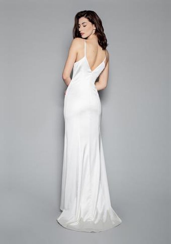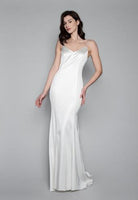 v neck, tank style with spaghetti straps, v back slip dress with sweep train