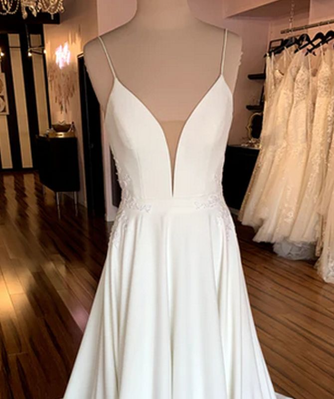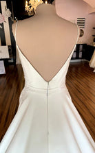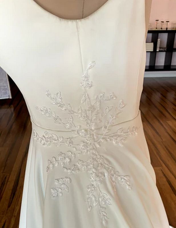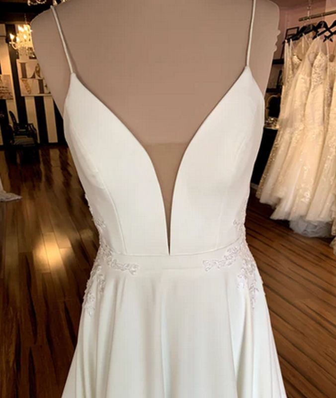 Soft, flowing luxurious multi-layered European soft crepe adorns the silhouette of our Fleur. Fleur is the ideal creation for the bride who wants a wedding dress that honours tradition yet embraces modern design. Beaded botanical embroidered lace accents adorn each side of the banded waistline, designed to highlight and enhance. Spaghetti straps continue to a deep plunge neckline with tulle inset, and slight scoop zipper V back, completing this bridal gown for graceful and romantic brides alike. The gown is midi length.