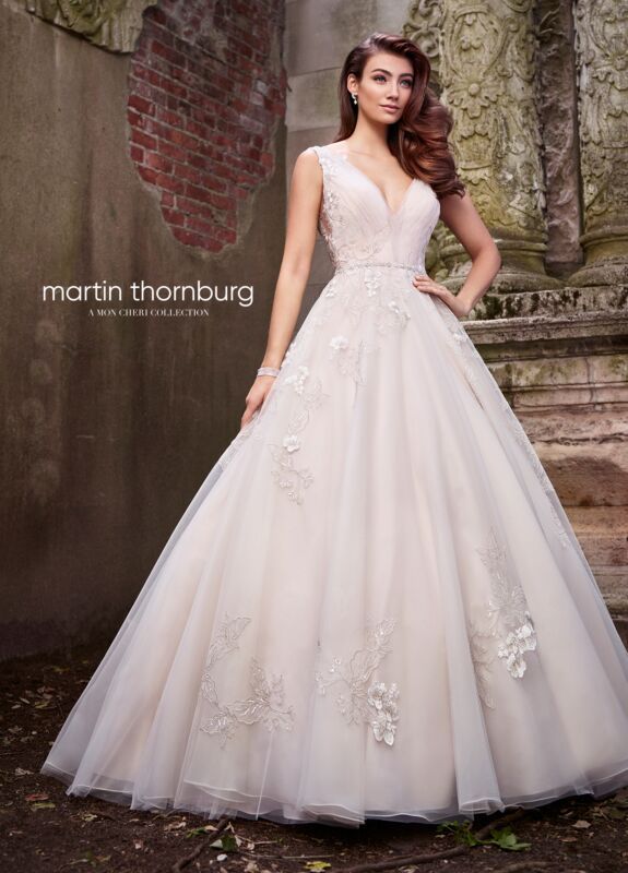 This Martin Thornburg 119256 Brianna ivory champagne wedding dress features an A-line silhouette in tulle and organza, with a V-neckline and an open V-back. Metallic lace appliques embellish the ruched bodice and the gathered skirt, finished with a beaded waistband, illusion sides and a cathedral train