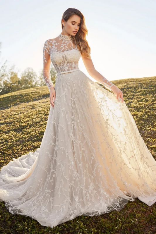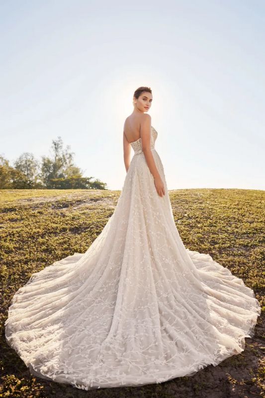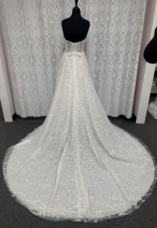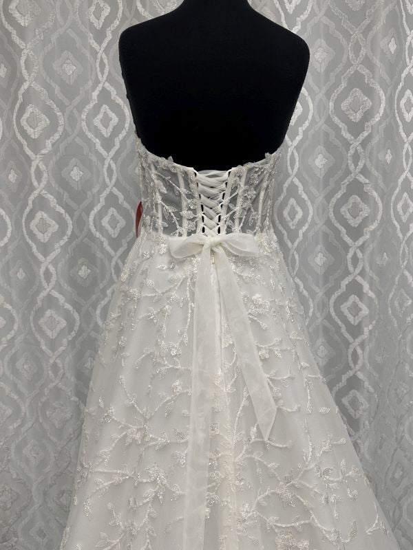 Our Arden wedding dress is a statement piece that features bold beaded lace, creating a striking and romantic A-line silhouette. The dress boasts an elegant detachable high neck and illusion detailing, giving it a modern classic feel. The sparkly tulle fabric adds a touch of glamor and shimmer, making the dress a true showstopper from all angles. The breathtaking sheer lace up back adds to the dress's allure and ensures that all eyes will be on the bride as she walks down the aisle. ***This gown does not come with the high neck topper. It is strapless. ***