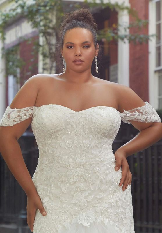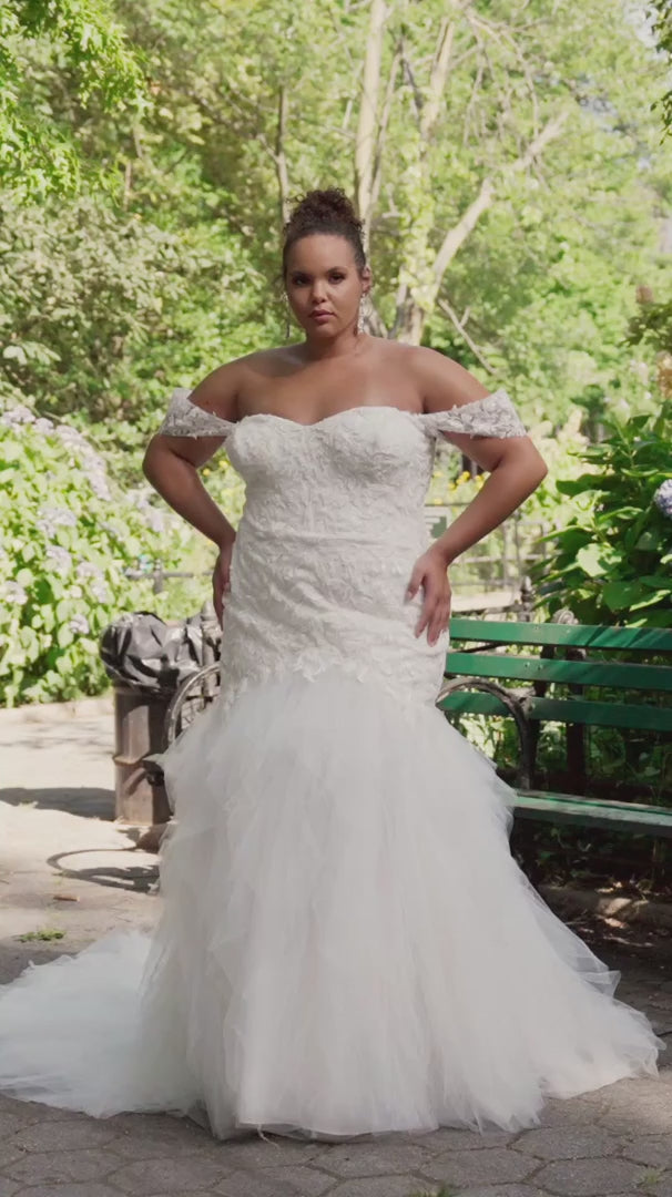 Our Hillary designer wedding dress serves decadent drama. The over-the-top mermaid has a soft sweetheart neckline on an exaggerated drop waist bodice, elongating your figure and hugging your curves. Delicately beaded, frosted embroidered appliqués are a gorgeous and romantic touch, but the wow factor really comes from the ruffled tulle skirt giving you fabulous texture for a glamorous wedding day look. Pair the dress with detachable off-the-shoulder sleeves for two looks in one. Shown in Ivory/Prosecco.