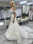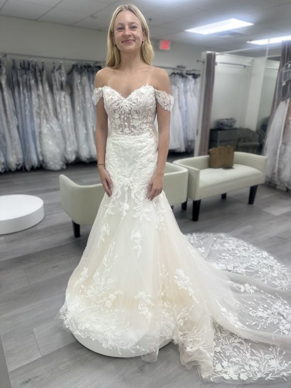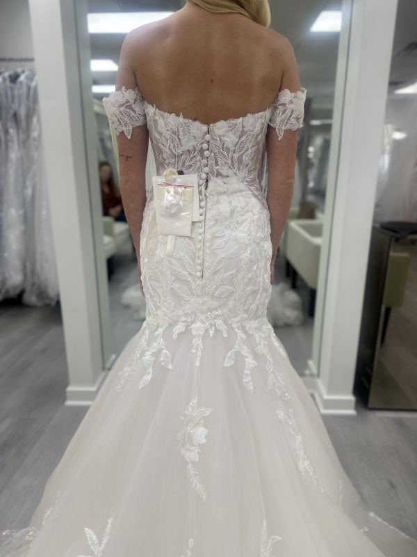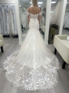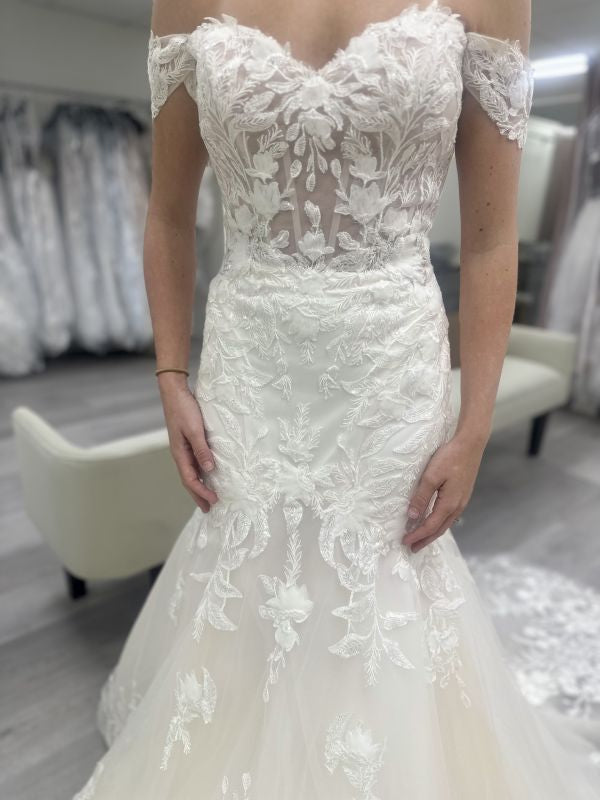 The embodiment of spring, our Persephone designer wedding dress is an explosion of color with frosted floral embroidered appliqués. The sweetheart bodice has a subtle sheerness that highlights the exposed boning, with detachable off-the-shoulder sleeves for styling options. The tulle mermaid has a lightweight feel and effortless look, and we love the romantic touch of the sheer appliquéd train.