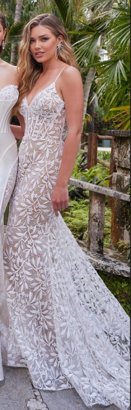 Spaghetti straps, v neckline, all over lace gown with back cut out. The fabric in this Ellie Wilde by Mon Cheri style is Venise Lace, Tulle, Organza, Stone Accents. This style features a Corset Bodice, Cut Out Back
