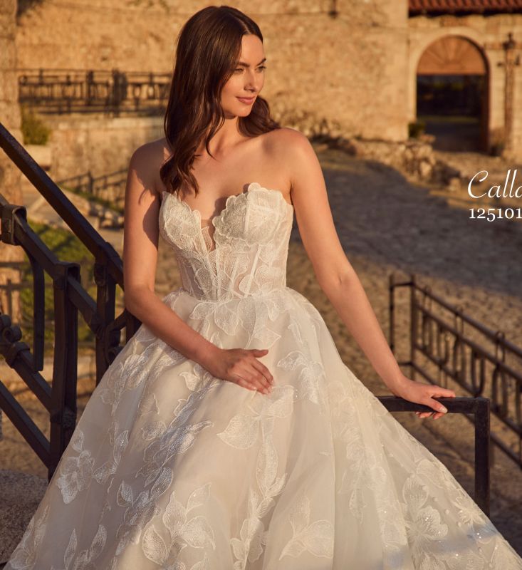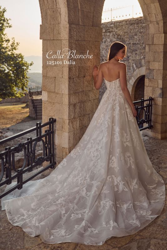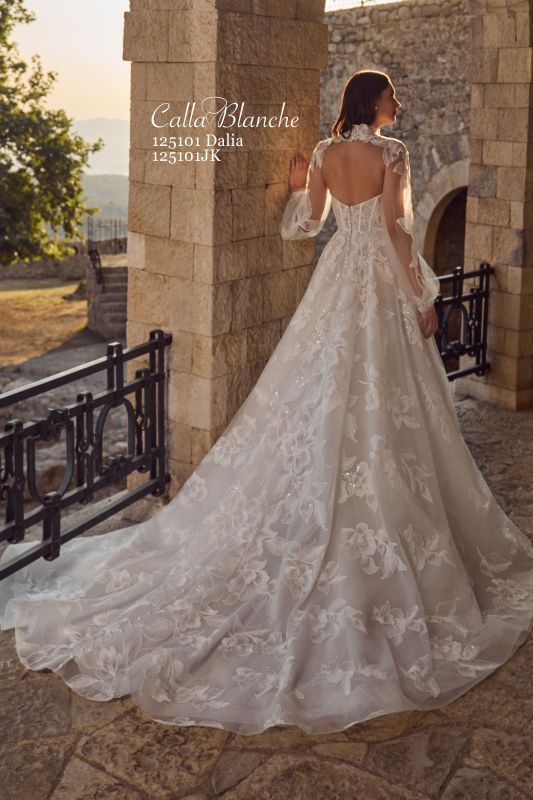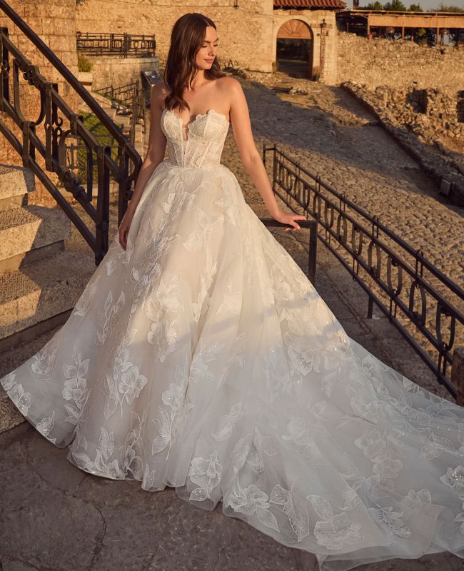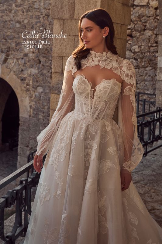 As beautiful as the flower she was named after, we dare you to unleash your inner romantic in our stunning strapless wedding dress, Dalia. Her A-line silhouette, crafted from layers of luxurious lace, shimmers with sparkly details that catch the light at every turn. This gown features a deep sweetheart neckline with the option of a mock neck long-sleeve jacket, offering two glamorous looks in one. Whether you choose to wear her strapless style, with her elegant jacket, or both, Dalia exudes timeless glamor with delicate lace. Pockets and a dramatic long train add both practicality and breathtaking drama, perfect for a bride who wants to feel like royalty on her big day. Matching veil is V2505C sold separately