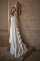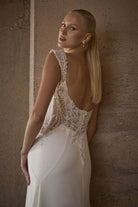 The Malibu sky glows with golden hues, reflecting off textured surfaces to illuminate each intricate detail of Ilona. This stretch matte satin and chiffon trumpet gown features a pointed scoop neckline and cap sleeves that can be worn on, or off-the-shoulder. The subtle sheerness of her bodice accentuates the exquisite beading and embroidery, highlighting the romantic spirit of the gown. This gown can be worn effortlessly due to a discreet zipper closure in the back. Complete this bridal ensemble with her matching fingertip veil (2604V), offered separately, for a refined touch that glistens under the sun’s golden light.