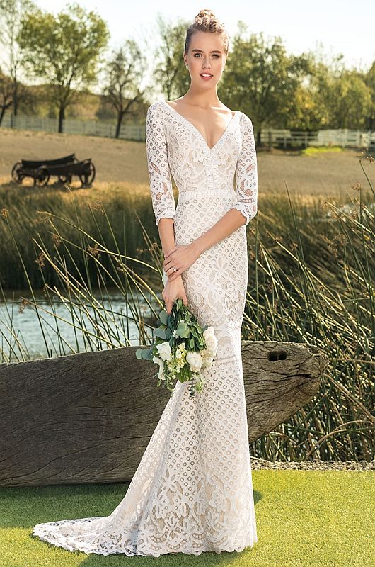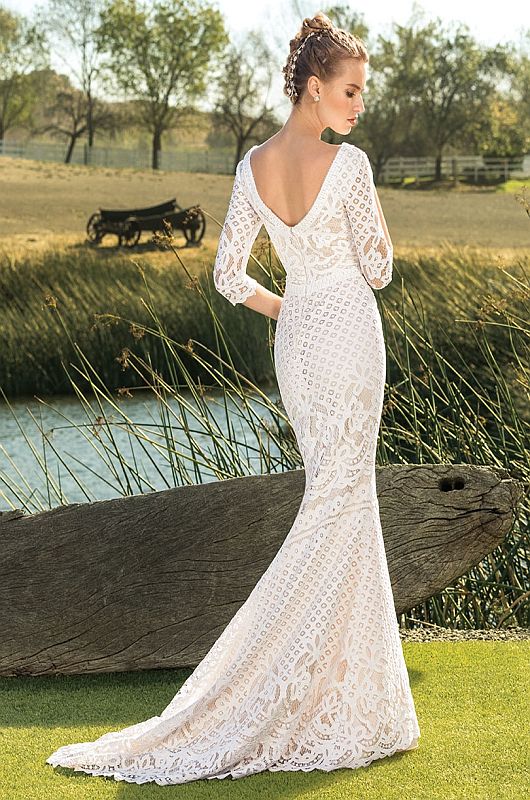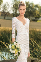 Brimming with bohemian ease, Sloane is a casual fit and flare wedding dress constructed from a textured stretch cotton lace, which is as comfortable as it is distinctive. The organic patterned lace leaves a gently scalloped edge at the hem of the chapel length train, as well as at the end of the three-quarter sleeves. A V-neckline in both the front and back are universally flattering.