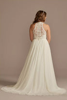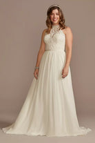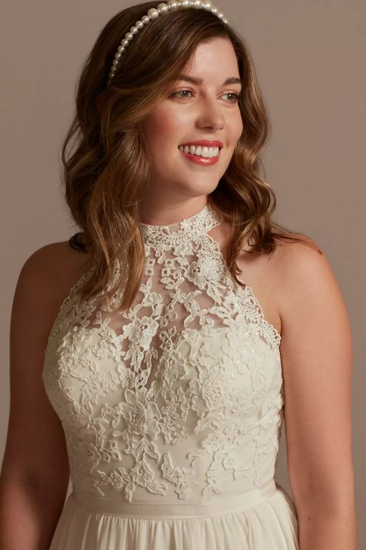 This high-neck wedding dress is the picture of effortless elegance. Illusion detail at the neckline adds an alluring touch, while the chiffon skirt has a flowy, romantic air.