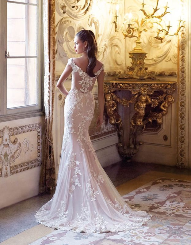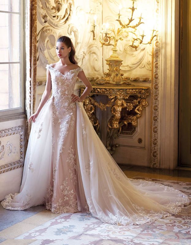 Exquisite beaded lace and Tulle create this stunning off the shoulder fit n flare gown featuring a sheer back with lace embellishment, Chapel train and luxurious, optional detachable Cathedral train