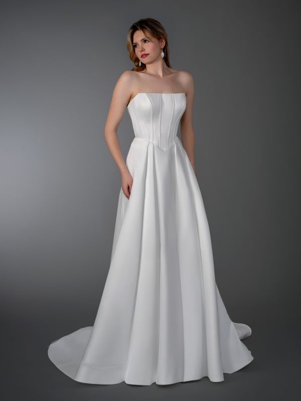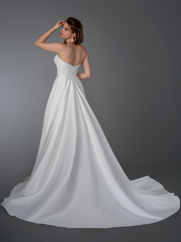 strapless, straight across neckline, boning with basque waist, slim a line skirt with chapel train