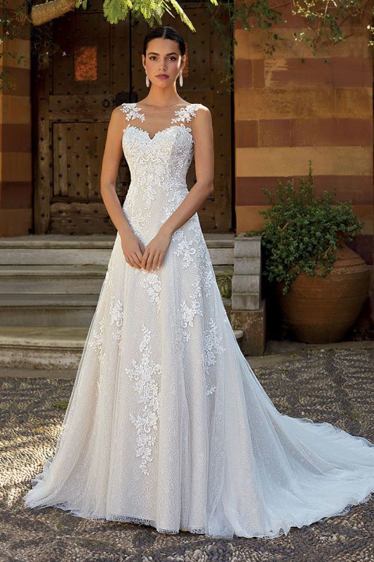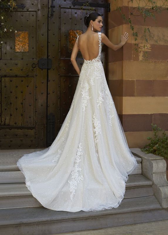 This elegant Lace gown features a Sweetheart neck bodice with a natural illusion neckline. striking lace appliques adorn the shoulders and transition into delicate straps that flow into a dramatic low back. The A-line skirt features a luxurious Chapel tra