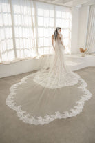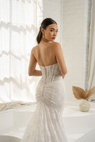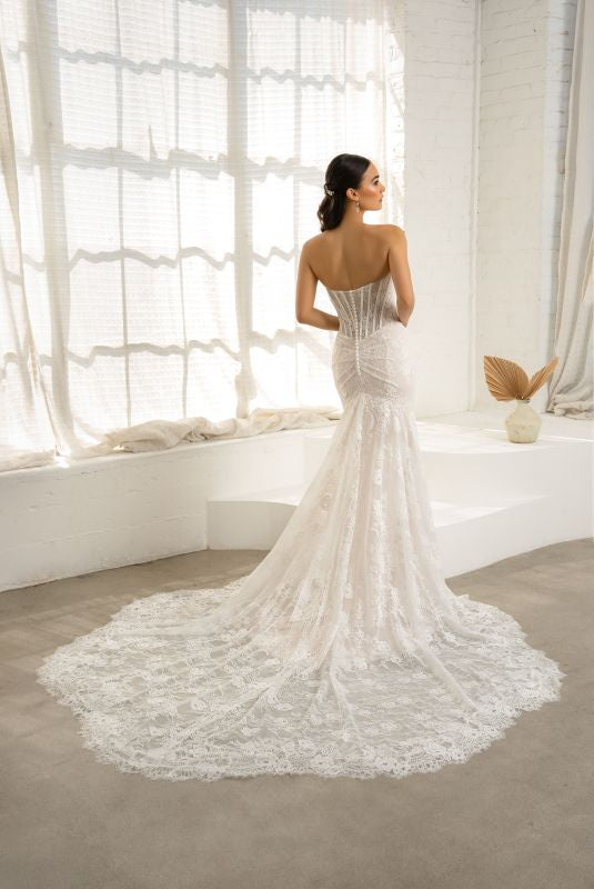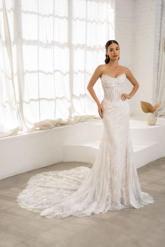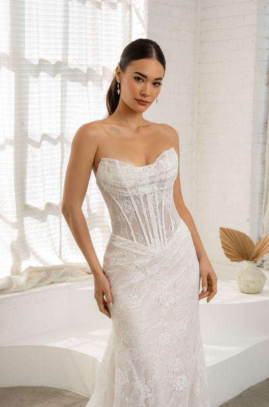 strapless, modified straight across neckline with slight cat eye with ruching across the bust area, all over chantilly lace with exposed boning leading down to a flattering basque waist, all over chantilly lace skirt, high back with the same exposed boning and cathedral train
