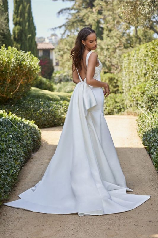 Sleeveless scoop neck trumpet gown with low back and detachable train with bow