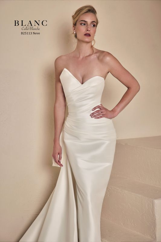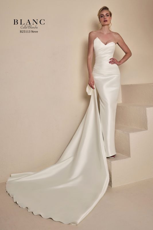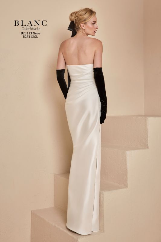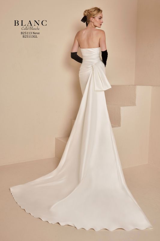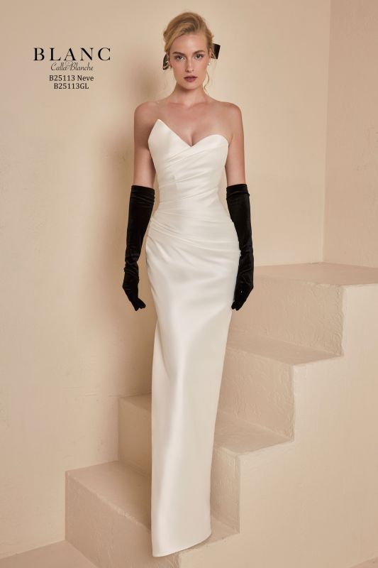 Step into vintage Hollywood glamour with Neve, a simple satin wedding dress that effortlessly combines timeless sophistication and modern drama. This elegant sheath gown features a sleek strapless design and an asymmetrical sweetheart neckline, perfect for brides who appreciate a minimal yet romantic silhouette. Paired with the striking addition of long, black gloves and/or bow, Neve's classic allure is elevated to new heights. For added versatility and grandeur, a detachable train flows gracefully from the back, allowing you to create a show-stopping entrance and carefree reception. Whether you're exchanging vows on a beach or under chandeliers, Neve guarantees effortless elegance with a touch of vintage-inspired sophistication.
