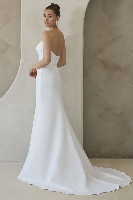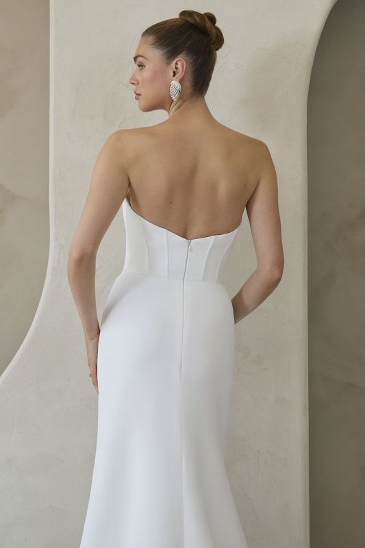 The Collyns gown is a modern, statuesque beauty with her sleek pointed scoop neckline and striking column silhouette. Featuring a strapless, fully lined corset bodice with exposed boning detail, and a natural waistline for a flattering fit. Cut in our incredibly soft knit matte satin, this gown is designed to hug every curve beautifully. In the back, her 63-inch train lays softly behind her with an option to add her matching A-line overskirt (offered separately) for a 2-in-1 bridal look with a 78-inch train. This accessory easily connects at the waistline with delicate hook-and-eye attachments and allows the bride to enhance her presence as she glides down the aisle on her big day.