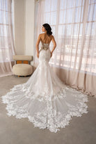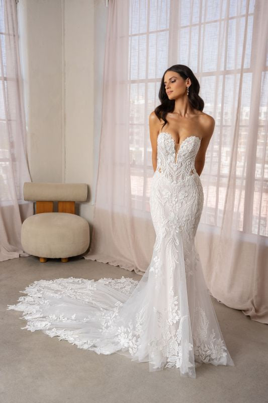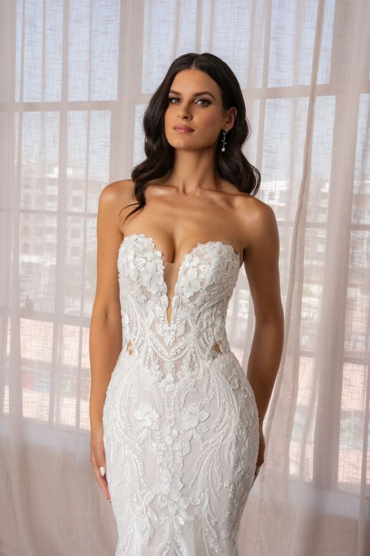 strapless, plunging sweetheart neckline, all over beaded sheer bodice, all over beaded lace mermaid skirt, sheer beaded back, signature Kitty Chen cathedral length train