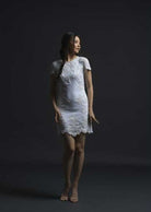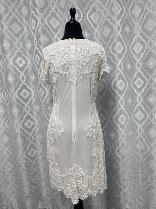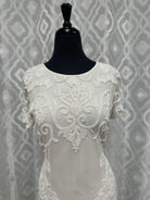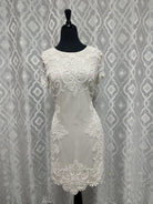 beaded lace appliques, scoop neck, short sleeve sheath dress. This dress is perfect for engagement photos, rehearsal, bridal shower, or going away