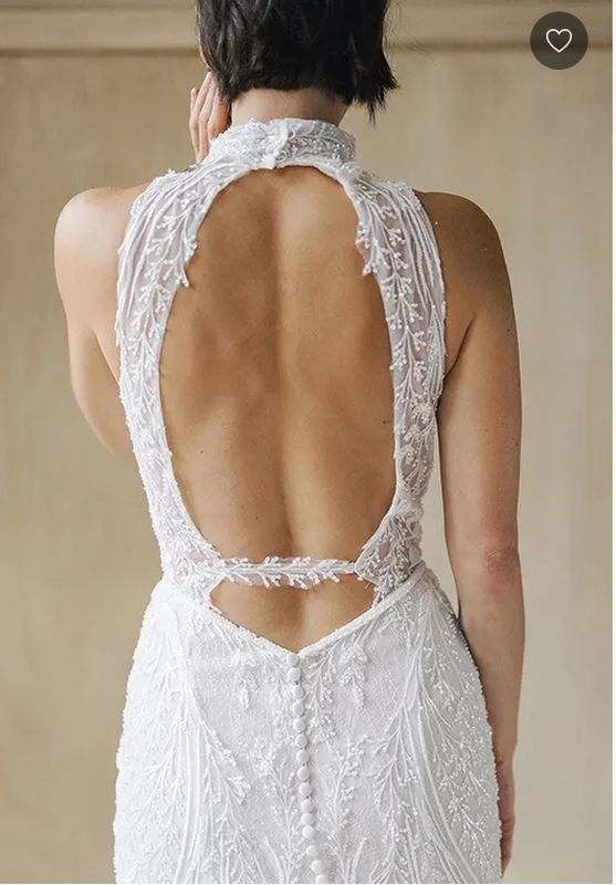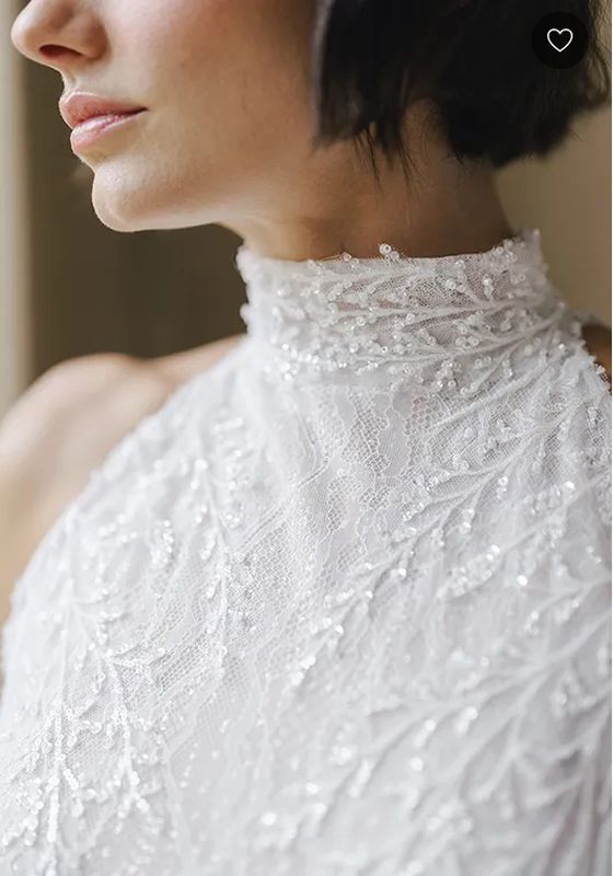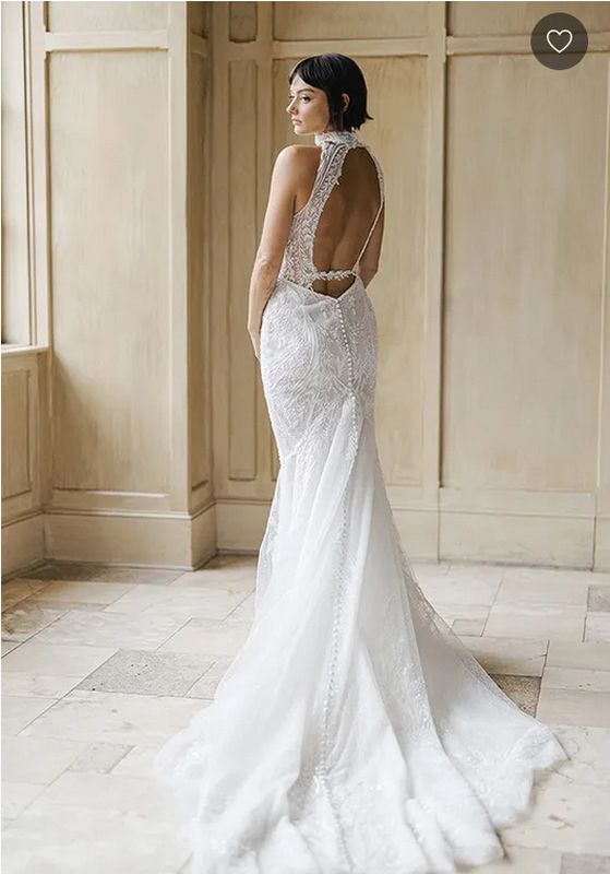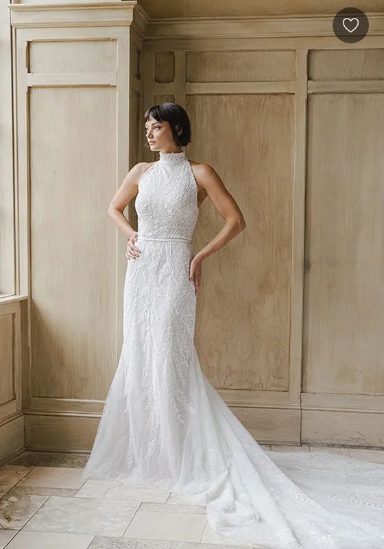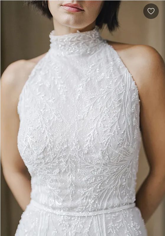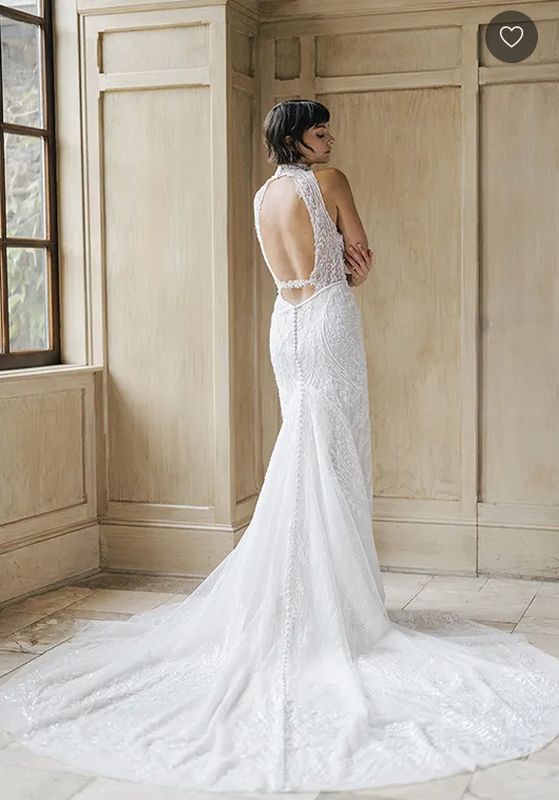 Capture every eye in this sleek and sultry column wedding dress. Style LE1314 features a high sleeveless neckline, elongating the figure and complementing the daring low back detail. The sheer graphic floral lace bodice is flawlessly tailored, with the front fully lined, as the column sheath silhouette glides over the figure, flattering every curve. A sexy wedding gown that could walk the runway, this fashion-forward dress resolves into a lace-embellished train for a romantic finishing touch.