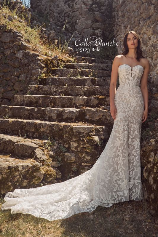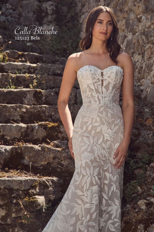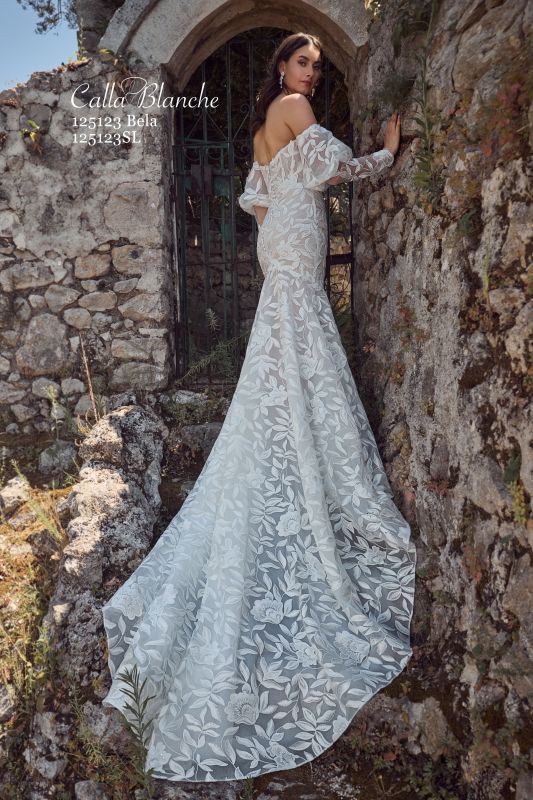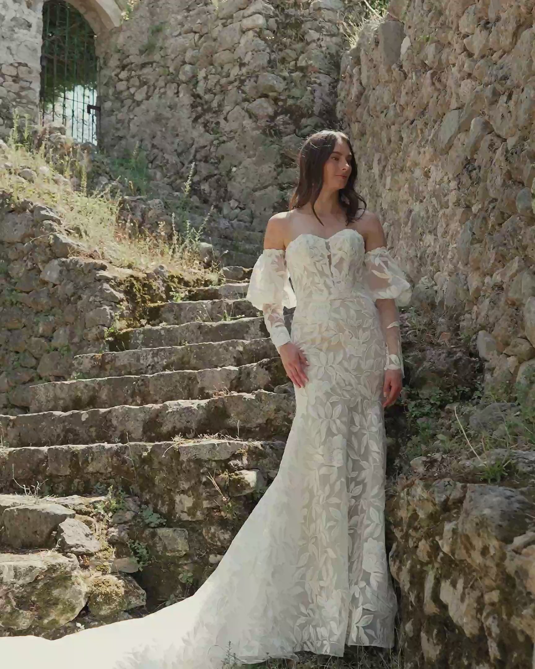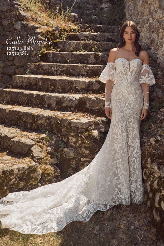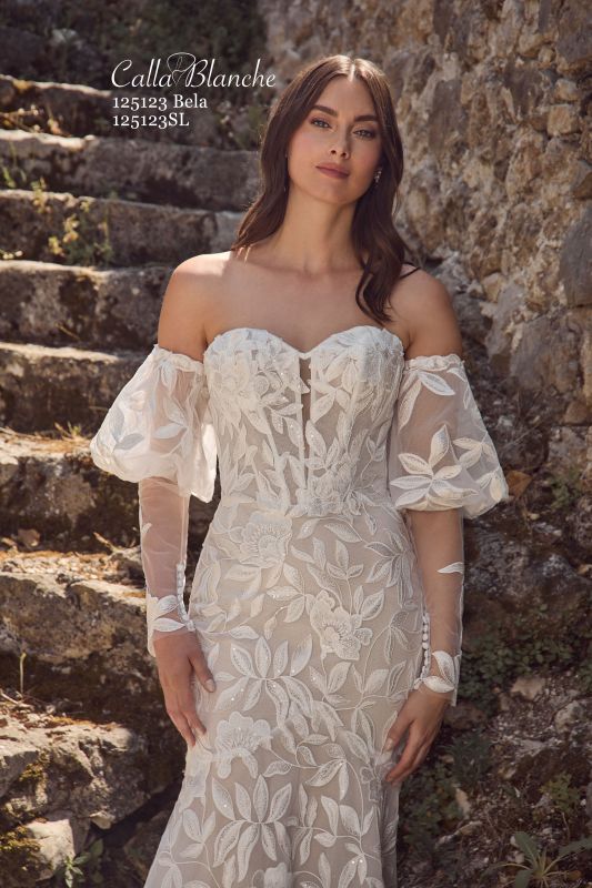 This mesmerizing mermaid wedding dress is a show-stopper for brides who want flexibility in style. Featuring an intricate lace design, Bela offers two equally alluring looks: a semi-sweetheart neckline with romantic off-the-shoulder puff sleeves (sold separately) or a timeless strapless silhouette. The detachable sleeves add a playful boho flair, while the fitted bodice and figure-hugging mermaid skirt create a glamorous, show-stopping entrance perfect for a destination or beach wedding. Whether embracing a sleeveless look or opting for the long sleeves, this gown exudes undeniable romance with her classic fit. Matching veil is V2511C sold separately