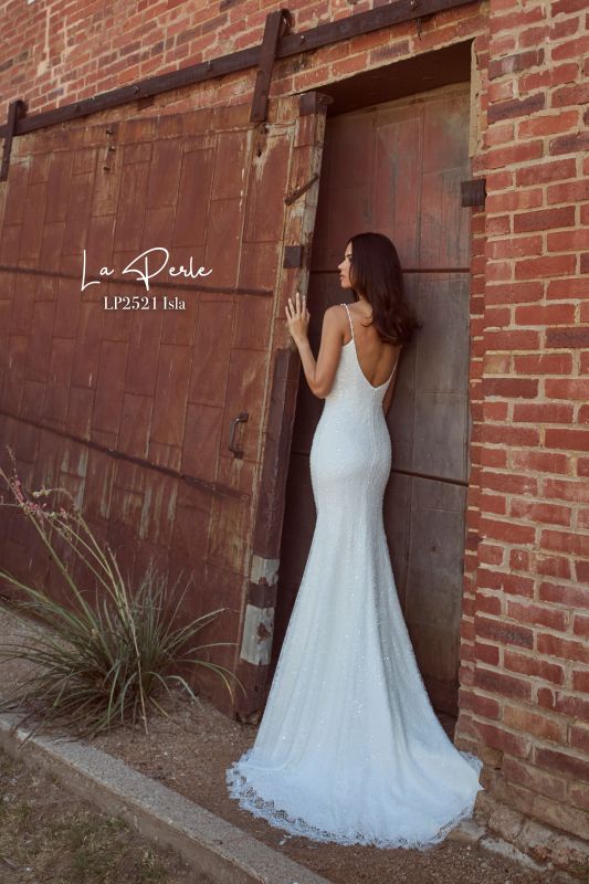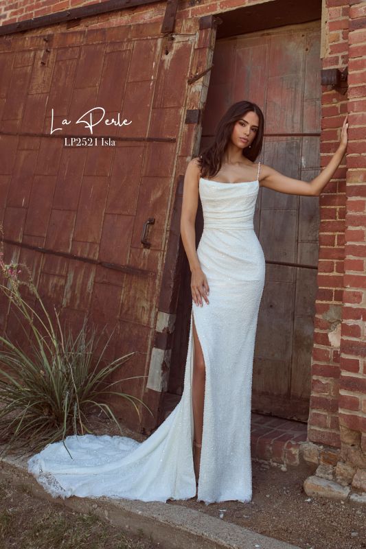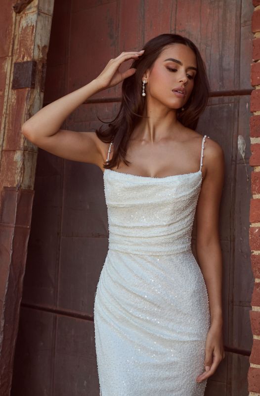 For the bride who craves a bohemian moment wrapped in elegance and a little stardust, there’s Isla! This sparkly sheath wedding dress, with her delicate beaded lace, offers a soft, shimmering glow that radiates sophistication. Her square neckline and dainty spaghetti straps add a touch of vintage allure, while her daring slit brings a fresh, contemporary vibe. Her figure-skimming silhouette gracefully flows into a chapel train, making a dreamy statement as you walk. Whether you’re celebrating in a rustic outdoor setting or an intimate garden gathering, Isla’s understated details, paired with her radiant sparkle, make it the ultimate gown for the bride seeking a balance of luxury and whimsical charm.