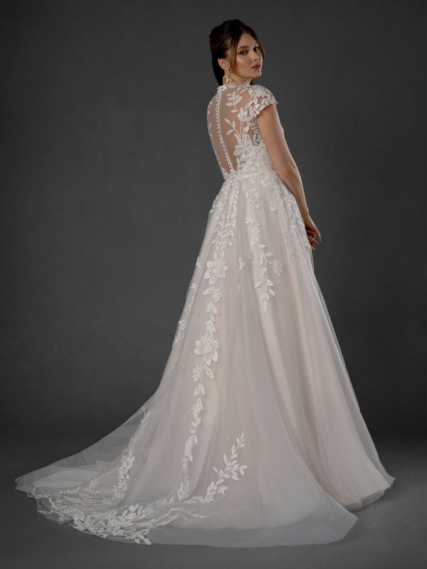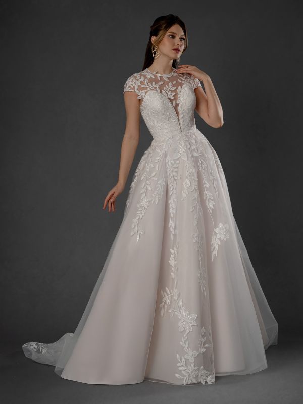 crew neck with illusion adorned with leafy lace, deep sweetheart plunge, cap sleeves, all over lace bodice with lace appliques on the full a line skirt, sheer back with button closure, semi cathedral train