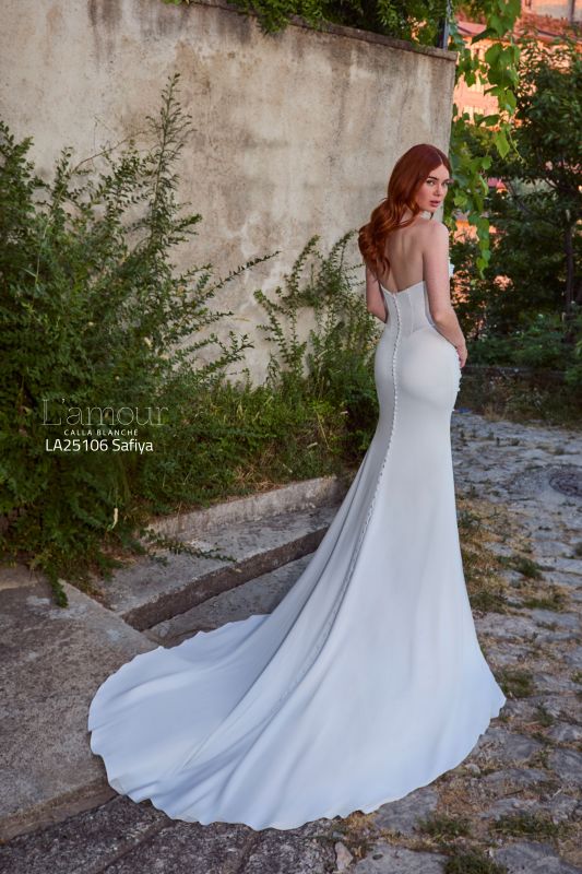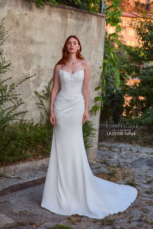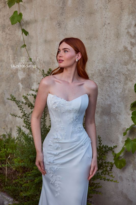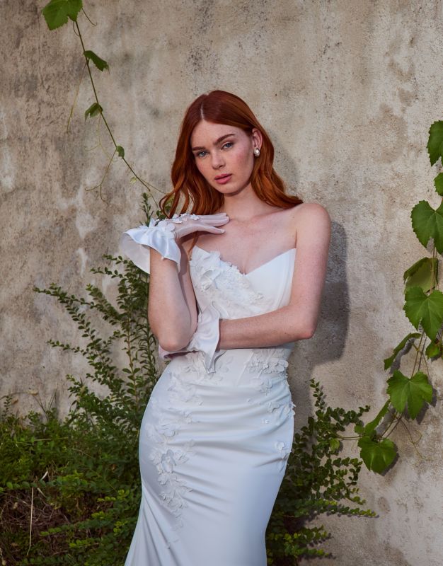 Ideal for brides who desire a classic style with a contemporary edge, this satin sheath wedding dress is perfect for an intimate garden ceremony or a chic urban loft. Safiya hugs your curves in all the right places, creating a sleek and statuesque silhouette that is both timeless and captivating. Her delicate floral appliqués bloom across the bodice, adding a hint of romance and texture, like a secret garden come to life. For those who crave a little extra drama, Safiya’s matching gloves offer a vintage-inspired twist, perfectly complementing her refined design.