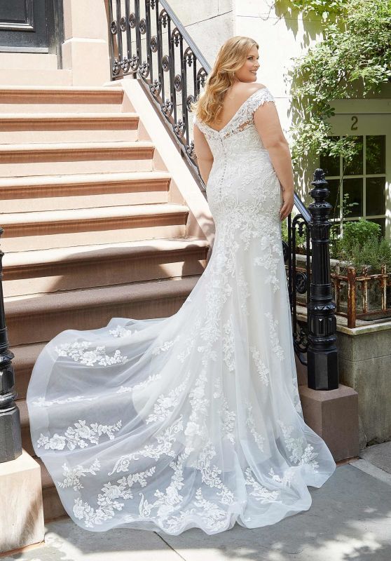 Heidi designer wedding dress is a curve-hugging fit and flare full of stunning details. The off-the-shoulder v-neckline beautifully shows off your decolletage with dainty cap sleeves, and a sheer touch in the back. The wow factor is the frosted embroidered lace that has a swirling effect, drawing the eye down the body all the way to the sheer train with horsehair edged hemline for added texture. Shown in Ivory/Champagne/Honey.