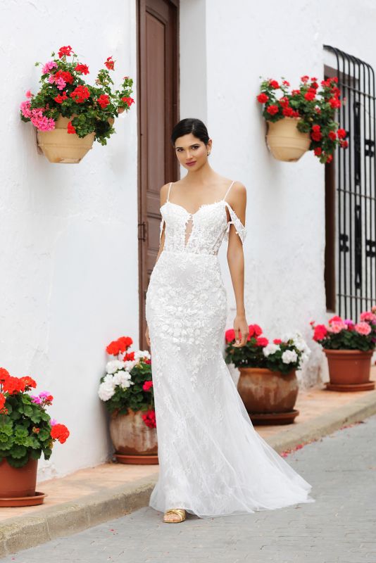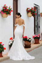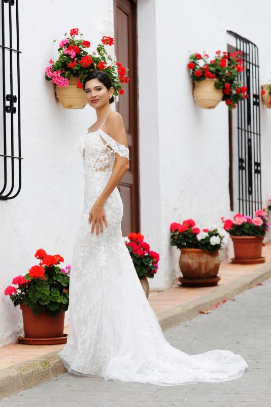 spaghetti straps with off the shoulder swags for a cold shoulder look, beaded lace bodice with cutout, beaded lace bodice, multi layer lace on the skirt, semi low v back, chapel train with horsehair edge