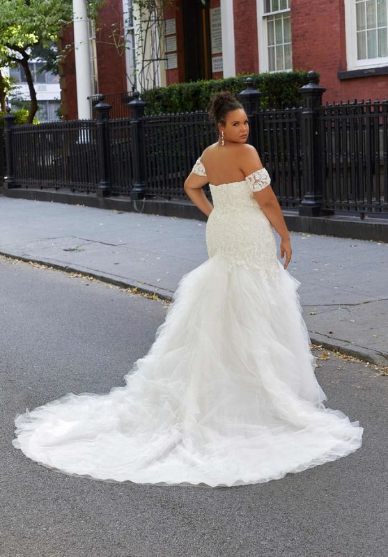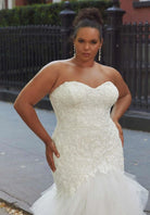 Our Hillary designer wedding dress serves decadent drama. The over-the-top mermaid has a soft sweetheart neckline on an exaggerated drop waist bodice, elongating your figure and hugging your curves. Delicately beaded, frosted embroidered appliqués are a gorgeous and romantic touch, but the wow factor really comes from the ruffled tulle skirt giving you fabulous texture for a glamorous wedding day look. Pair the dress with detachable off-the-shoulder sleeves for two looks in one. Shown in Ivory/Prosecco.