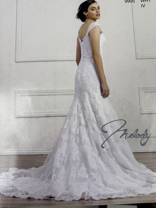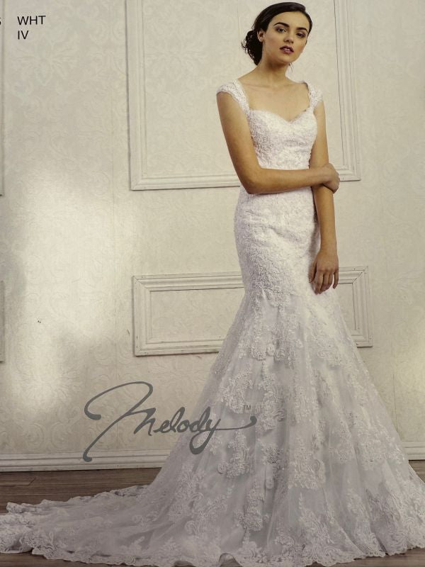strapless, sweetheart neckline with detachable cap sleeves, all over Alencon lace, corset back, cathedral train