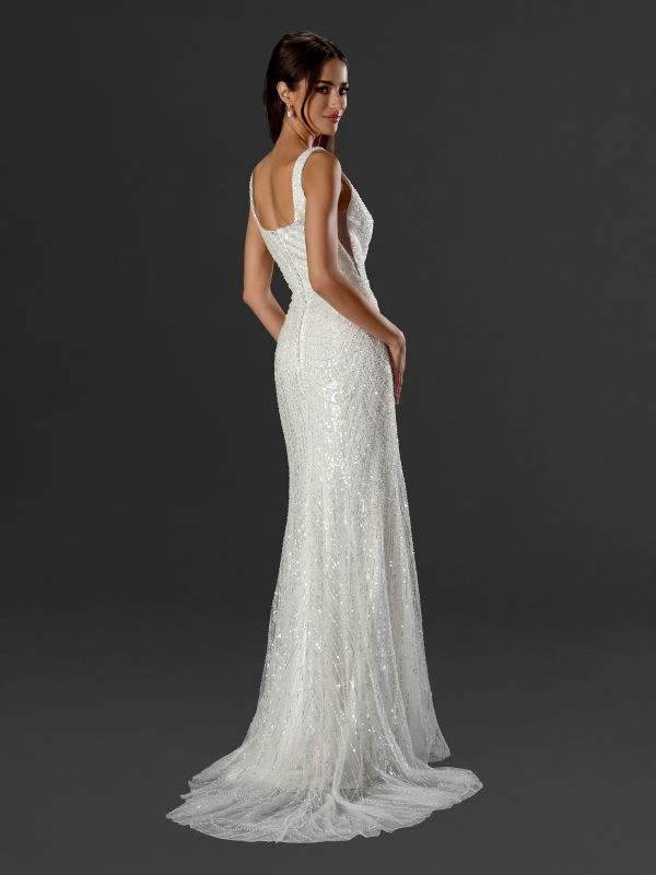 tank style, square neckline, open sides with illusion, sheath silhouette, high back, sweep train