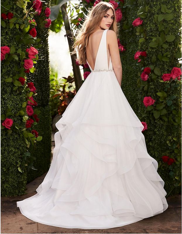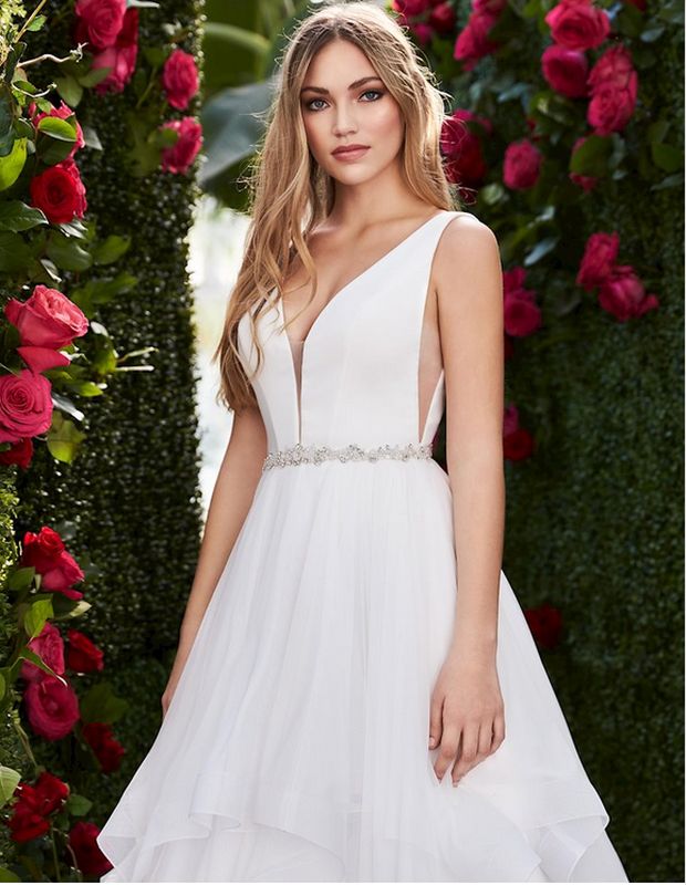 Crêpe and Mesh Tulle Wedding Dress. Crêpe bodice with plunging V-neckline. V-shaped Italian Tulle inserts at side seams. Multi-layered Mesh Tulle skirt with 2″ horsehair at hem. Gown does not come with the beaded belt