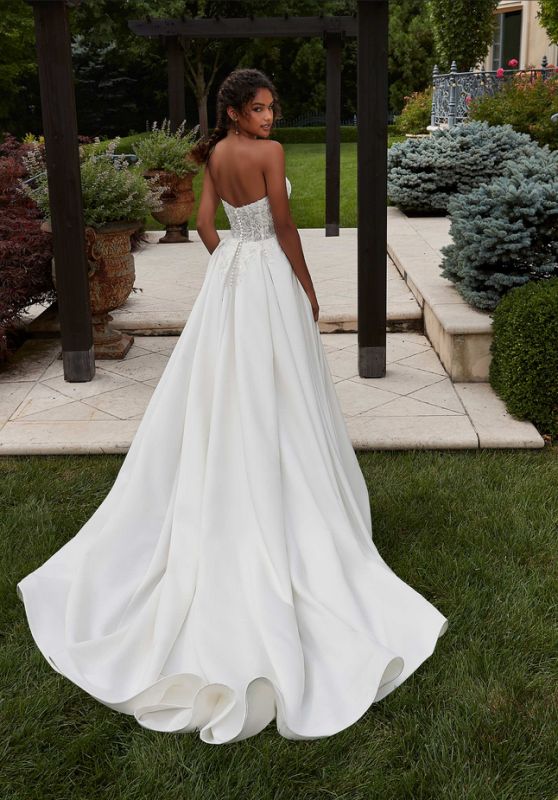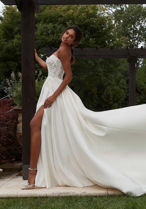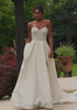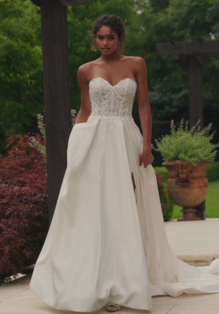 Our Patricia designer wedding dress is an elegant A-line with classic details. The strapless sweetheart bodice features intricate frosted, embroidery with boning for added structure and support. The sleek, pleated satin skirt creates a lovely contrast, floating off the body in an A-line silhouette. The front skirt slit shows off some skin and we love the fun addition of pockets to the gown