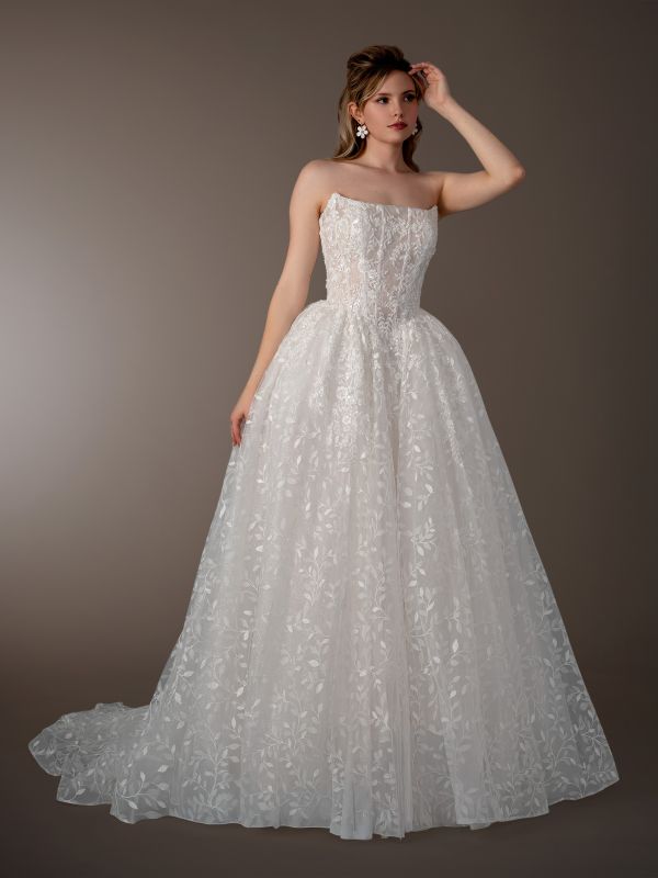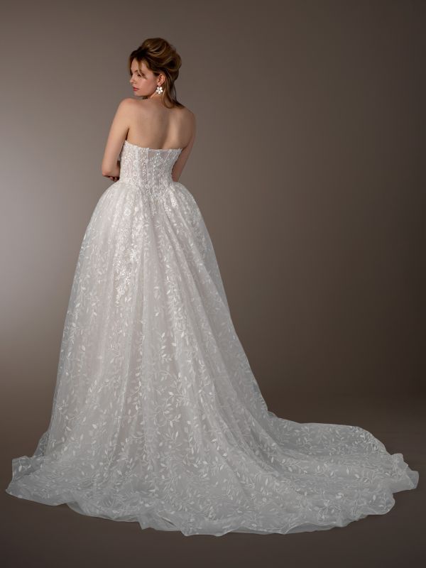 strapless, straight across cat eye neckline, all over beaded lace bodice, full lace ball gown skirt with some beaded lace, basque waistline, pleating over the hips, semi high back, semi cathedral train