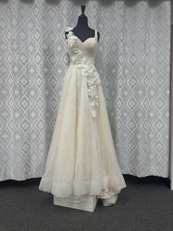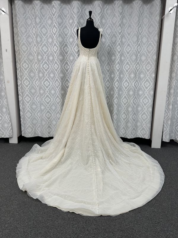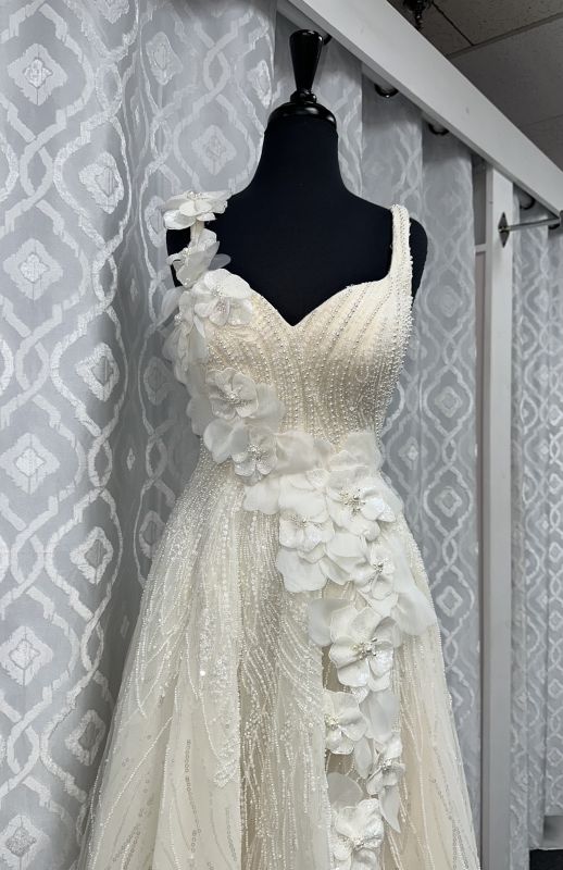 tank style with sweetheart neckline, all over beaded bodice adorned with delicately beaded flowers that trail down onto the a line skirt, semi low scoop back with cathedral train