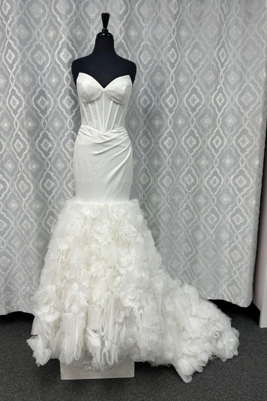strapless, sweetheart neckline, visible boning in the bodice, semi basque waist, ruching at the hip and on the butt, full fluffy skirt with semi cathedral train