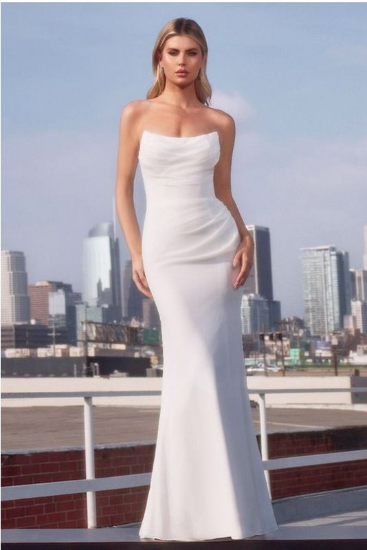STRAPLESS, cat-eye neckline, CHIFFON FITTED OFF-WHITE DRESS with corset back