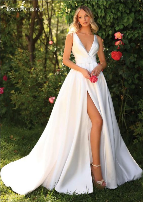 wedding gown. This gorgeous dress features a deep v neckline, a