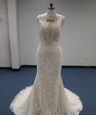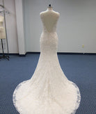 tank style deep v-neckline with beautifully embriodered lace applique detail and sparkling sequin throughout the trumpet silhouette deep b-backline and full tulle detachable train