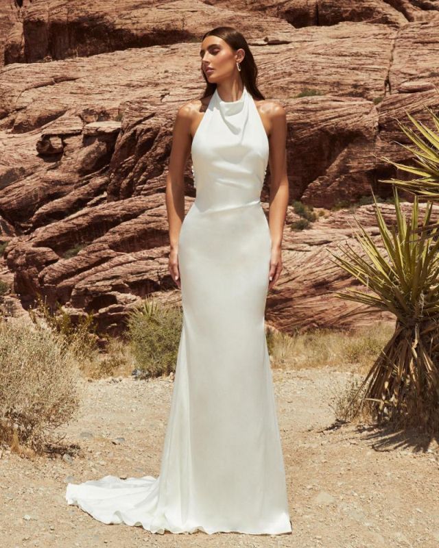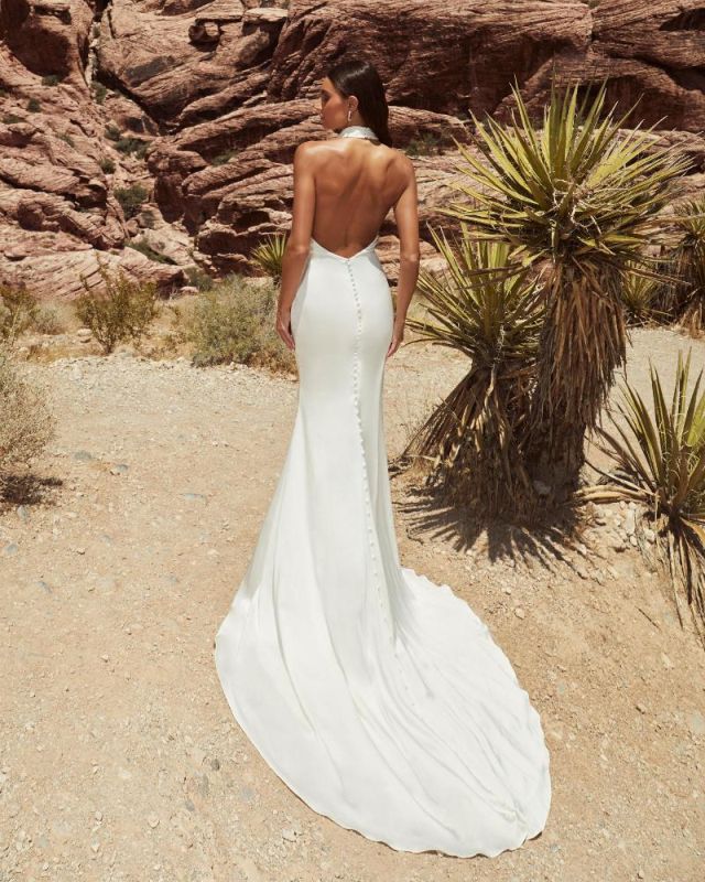 Let your inner siren of the sea emerge in our captivating Lucia gown! Her sexy sheath silhouette hugs every curve much like the gentle embrace of ocean waves. Her daring backless design is paired with a modest high neckline and romantic button details on the train to create the ultimate traditional wedding dress design. Speaking of her backless design, it can be adjusted with a removable back cowl, offering brides a small change between ceremony and reception. Lucia ensures a voyage of elegance and style!