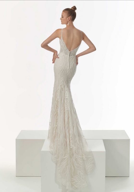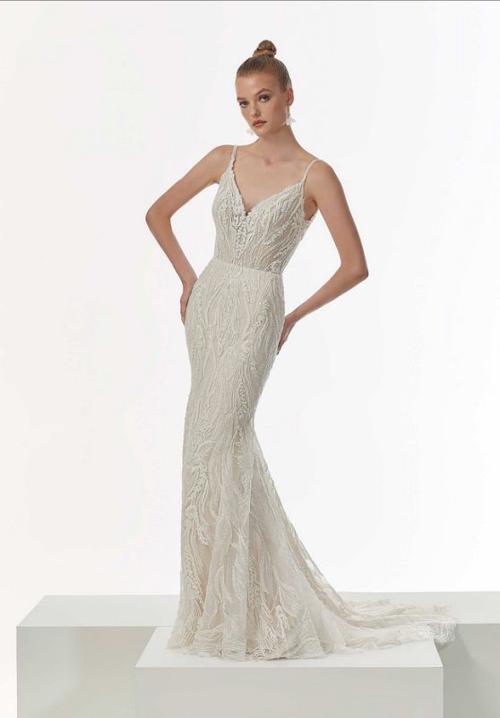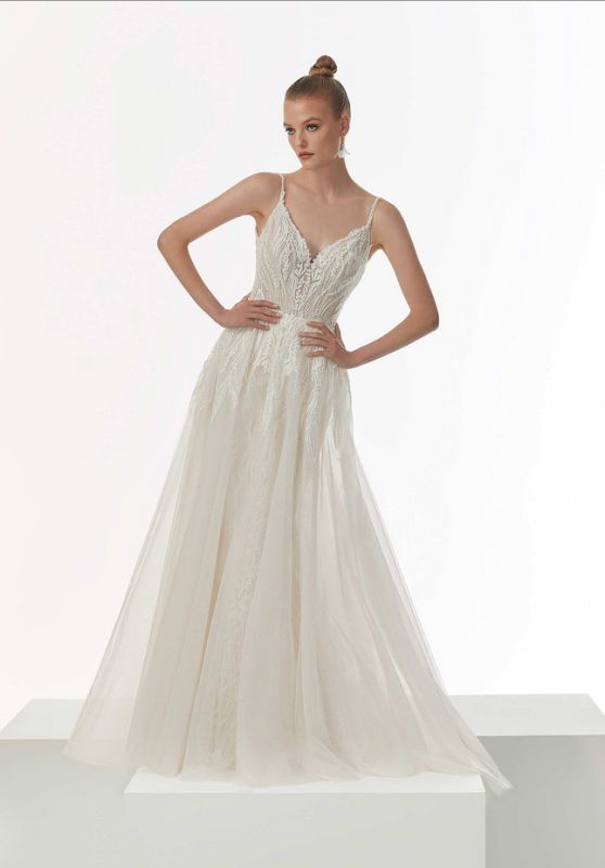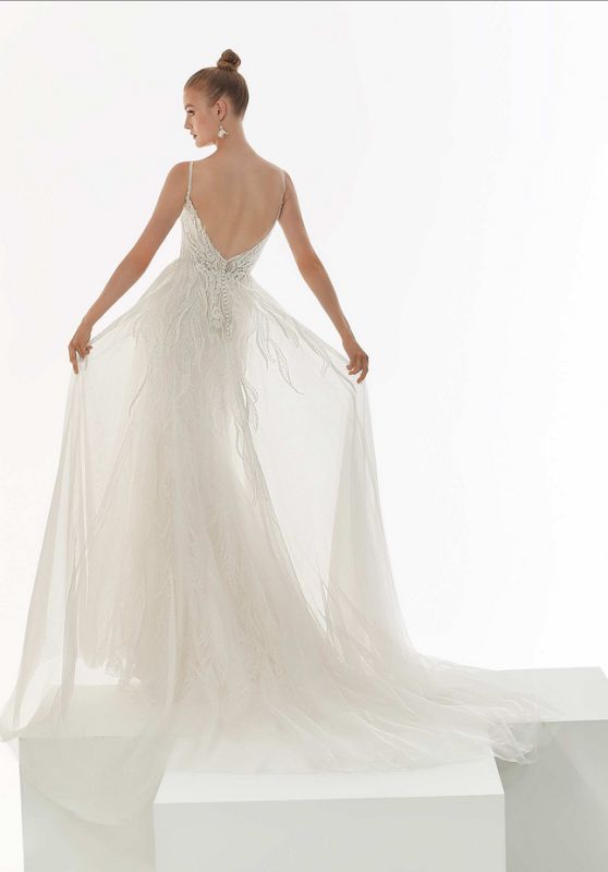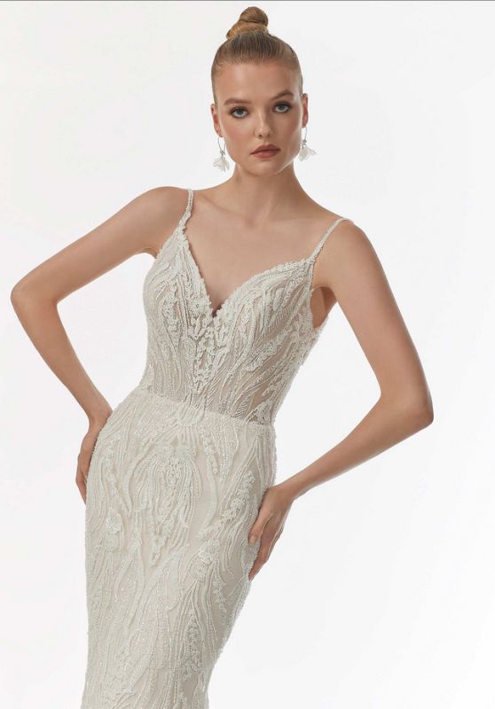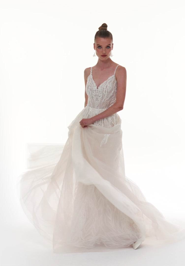 Our Narcissa designer wedding dress features allover beaded embroidery in an intricate pattern that creates a subtle, yet striking, effect and draws the eye down the body. The fit and flare silhouette hugs your curves, in dimensional sparkle net, with a classic v-neckline and matching v-back. The detachable full sparkle tulle overskirt changes the silhouette creating an elegant A-line shape giving you two looks in one. Shown in Ivory/Champagne/Honey.